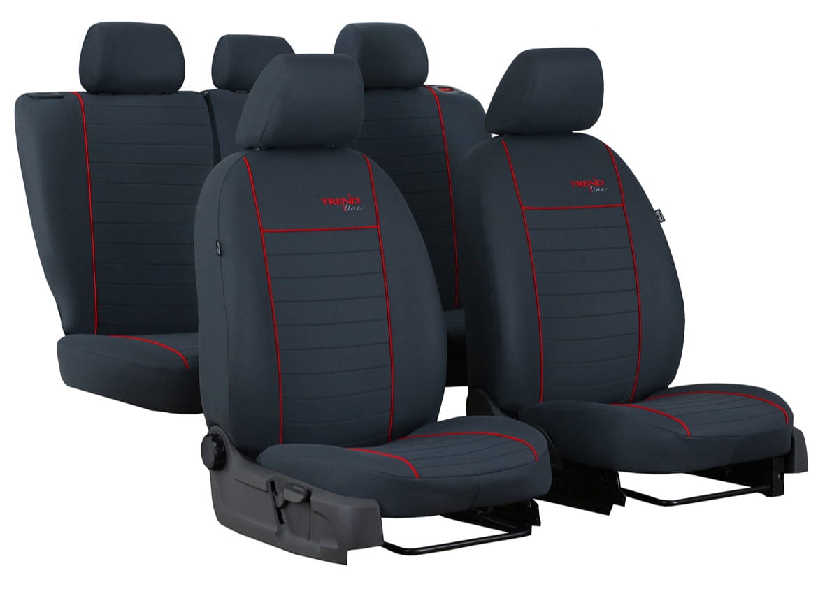 Pokrowce samochodowe Materiałowe Trend Line wykonane są dzianiny tapicerskiej. Materiał na pas środkowy jest łatwy w utrzymaniu czystości. Pokrowce mają podwyższoną odporność na ścieralność oraz zużycie.